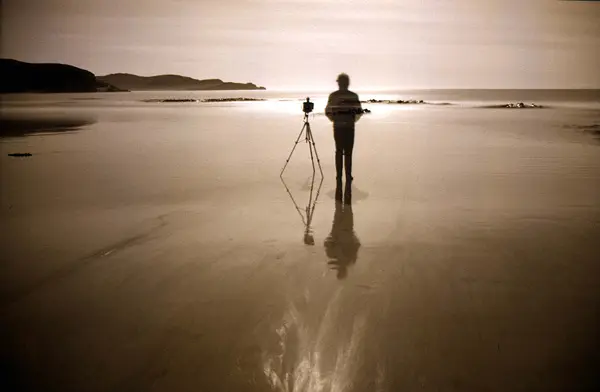 That autumn I was touring the country with a lady friend, doing my first calendar for Friends of the Earth. On this tranquil evening in south Otago I’m standing by the Linhof 4×5, timing a long exposure of the limestone cliffs across the bay. A good jacket and a cap warms me from the stiff sea breeze, and gumboots (wellingtons) keep the damp away; waterproof boots are a real boon for the night photographer. The translucence shows that I’ve walked into the exposure after it’s begun, as self-timers can’t do time (B) exposures. The beach is wide and gentle on the receding tide, while surf breaks on the far rocks. There is some movement in the thin cloud cover also, although the cloud was only intermittent. The two shadows are matched with reflections off the wet flats.