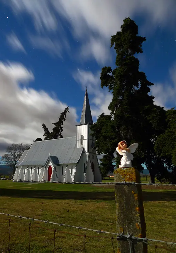 What’s a little unusual about this scene – not the long exposure (60 secs at f2, ISO 200), the moonlight or the cherub (supplied of course by the photographer) – is the vertical composition. The spire and the height of the trees make the usual horizontal composition here fairly difficult, but they are well adapted to a vertical composition, as seen here in wide angle (24mm in 35mm film terms). Strong vertical elements are usually required for the success of vertical compositions, and this has at least three of them.