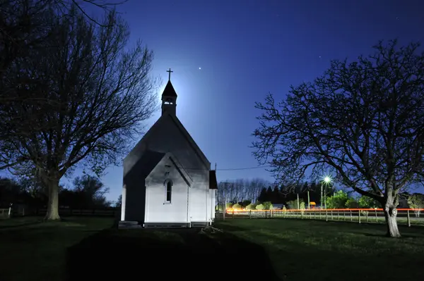 Heading out for the first time to the coast at Waimarama, I was anticipating a typical modern bach-and-beach settlement, so was surprised to see this old style church on the edge of town, so to speak. The moon was rising directly behind it, giving me some quick exercise with the new 85mm telephoto, and it was only when a car came by that I saw the potential of a wide angle view with headlights on the building.