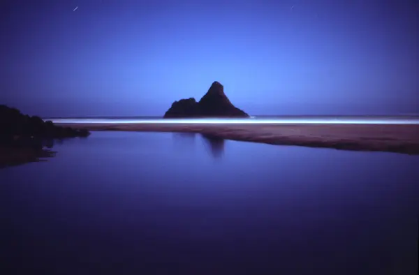 The picture elements here are very simple: an even vignetting from the lens barrel plus almost a mirroring of sky and lagoon, two brief star trails in similar positions – but why is the islet right in the middle? The rocks are volcanic, the sand more likely grey than tawny, and the tinge to Panatahi tells of a declining moon. Time of night I did not know but it must have been about 5 am.