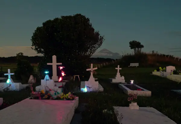 The zoom was not quite at widest – 28mm in full frame terms – on the Lumix LX3. The mountain was almost bare of snow and ice, as it is in late summer. The white graves and the moving lights indicated a Maori graveyard, while the presence of farewell goods on some graves was an unusual sight to us Pakeha. You tend to think of cemeteries as unchanging places but a few months later when I came back at sunset I was surprised at the work in progress, giving improved access and fencing off the tapu ground more adequately.