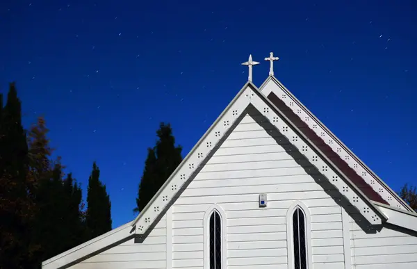 This simple image depends for its impact on the white & blue contrast and the unexpected double cross. Also visible is the Southern Cross constellation, moving with the other stars in this 40 second exposure. Some uncommon fretwork and the conical pines serve as additional points of interest. The lens was set at f2.8, the maximum when the Lumix LX3 zoom is at the telephoto end – a modest 60mm in standard film terms. ISO was 100 and the frame has been slighly cropped to partly correct my poor levels with the tripod.