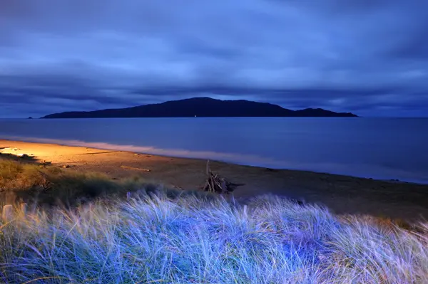 The moody blue of the background is of course my old friend tungsten, although this option on the D700 is called Incandescent. I chose it not so much for mood but to reduce the sodium orange of the strong shore lighting coming from the boat club. From this, tungsten has turned the gentle surf into a line of pink. The solitary light on the island must be from Department of Conservation quarters, as their staff are the island’s only inhabitants.
