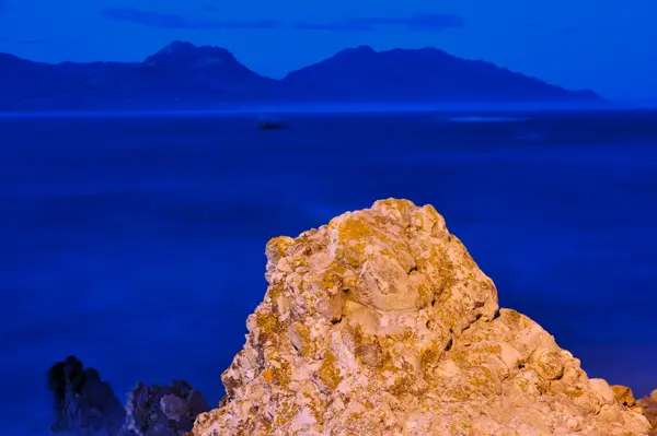 The surreal song lyric [misquoted on the web] fits this enigmatic view from the waterfront pavement at Kaikoura, in the South Island. The scale is ambiguous and the light unusual, but at least more sense can be made of it than of Dylan’s allusion to the Book of Isaiah (thanks, Bob). The rock looms out of the deepening dusk as the street light over my shoulder gradually takes command; meanwhile the sun sinks further below the horizon.