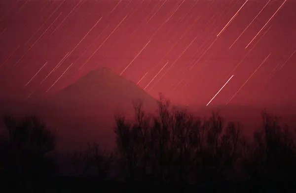 The peak could not be discerned through the long Takumar telephoto on the Pentax Spotmatic F, as its maximum aperture is f4. Actually the mountain was hardly visible by eye, and this composition could only be made by referring to a 60-second trial shot on the Lumix LX3 – which does not have a telephoto capability. I then extrapolated a longer exposure (unrecorded) for better star trails and a smaller aperture, to get the best focal depth from the lakeside trees to the mountain.