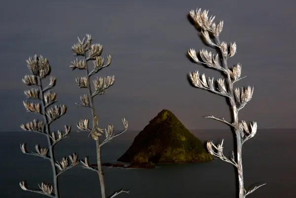 Here you see no ships nor port, but a curious effect of some tricky experimentation. Changing the focus manually during exposure gives two planes of focus! For technical reasons this works best on telephoto, using flash before a time exposure. The shadows are really silhouettes after the flash, where the flax stirred in the breeze.