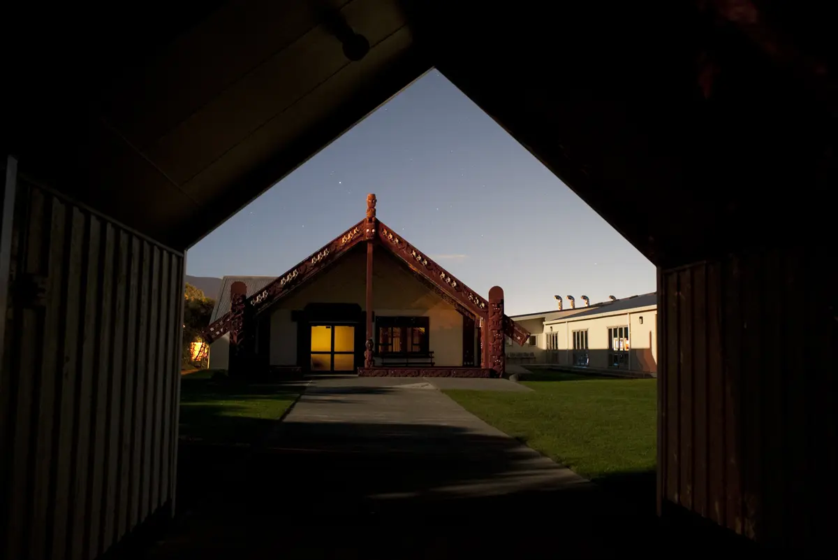 The Whakatu marae sits on 10 hectares of reclaimed estuary next to Founders Park, in the city. It is hub to six iwi: Ngati Koata, Ngati Kuia, Te Runanga o Toarangatira, Ngati Rarua, Ngati Tama and Te Atiawa. I took this scene because the entrance-way nicely mirrored the meeting house profile; the roofline vents also added interest. The light within the wharenui (Kaakati) was very dim, but that was just what was needed to balance with the moonlight.