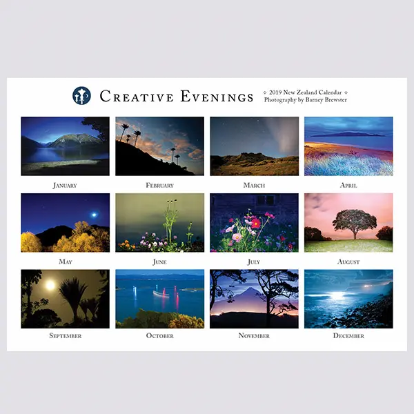 This new-concept New Zealand calendar celebrates almost ten years of digital discovery with a retrospective selection, drawn from my previous printed calendars. Mainly focussed on night photography, those calendars have all been small-run affairs of only a hundred copies or so each. My Creative Evenings 2019 calendar is free to download and print, to hang on your home or office wall, or to gift to friends or family. This high-res pdf file is ready to go, as all images have been converted to CYMK and are suitable for print.