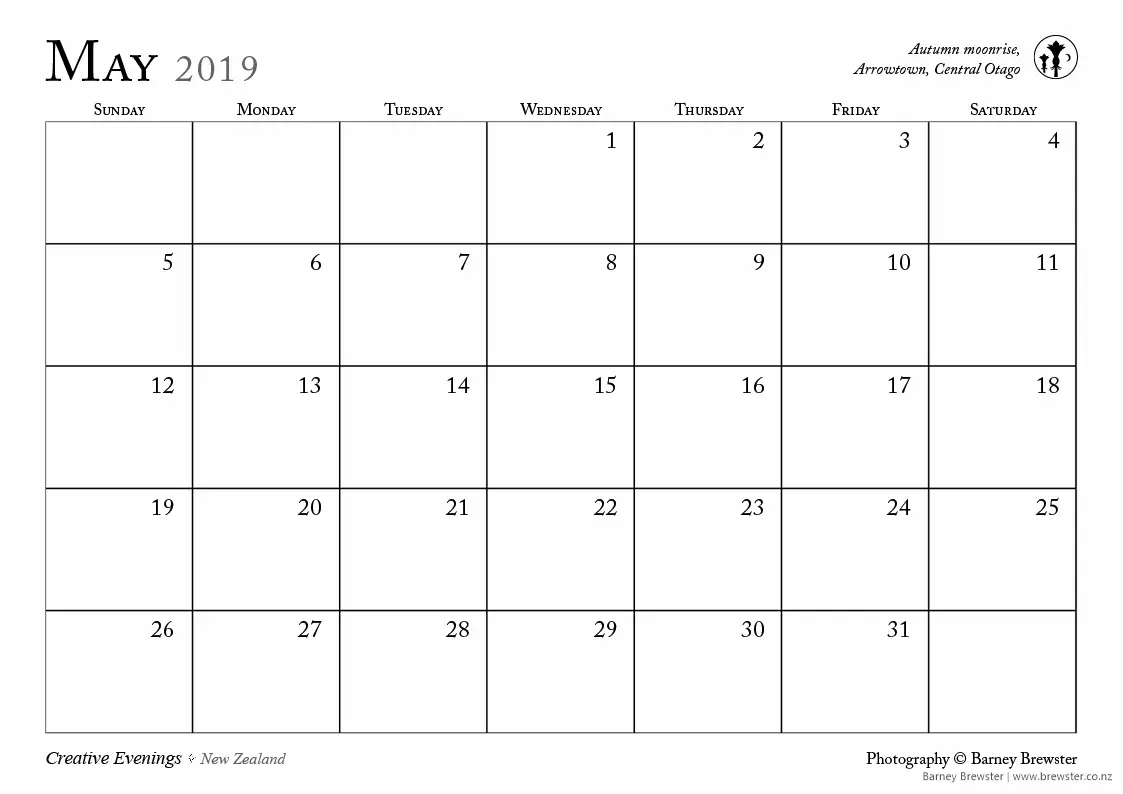 This new-concept New Zealand calendar celebrates almost ten years of digital discovery with a retrospective selection, drawn from my previous printed calendars. Mainly focussed on night photography, those calendars have all been small-run affairs of only a hundred copies or so each. My Creative Evenings 2019 calendar is free to download and print, to hang on your home or office wall, or to gift to friends or family. This high-res pdf file is ready to go, as all images have been converted to CYMK and are suitable for print.